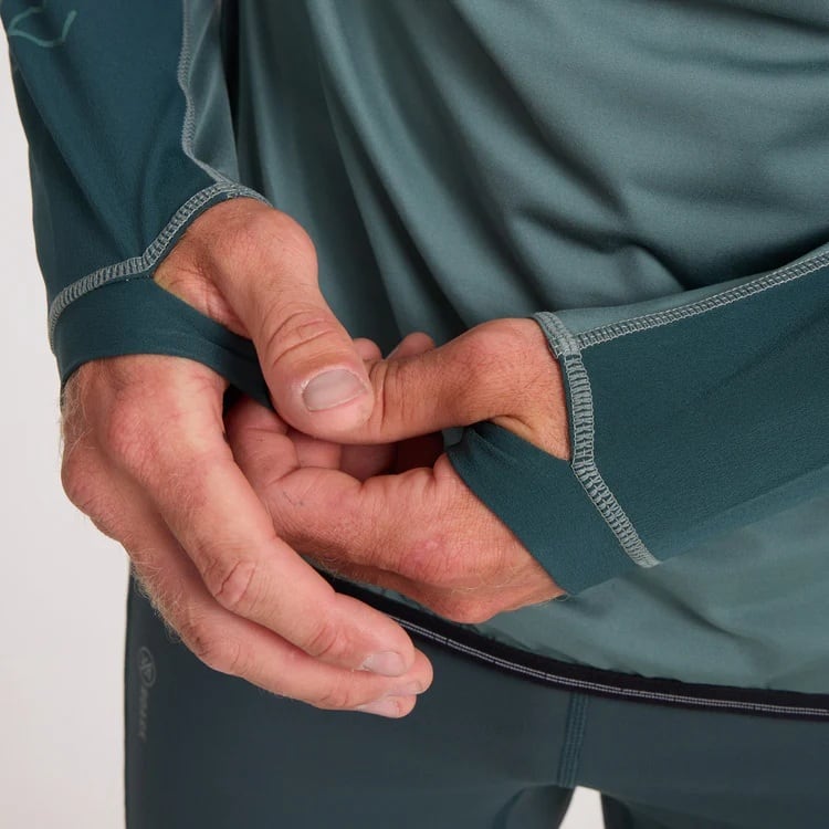 ラグランショルダー設計が動きを妨げず、サムループ付きの袖口が手首の冷えを防止。